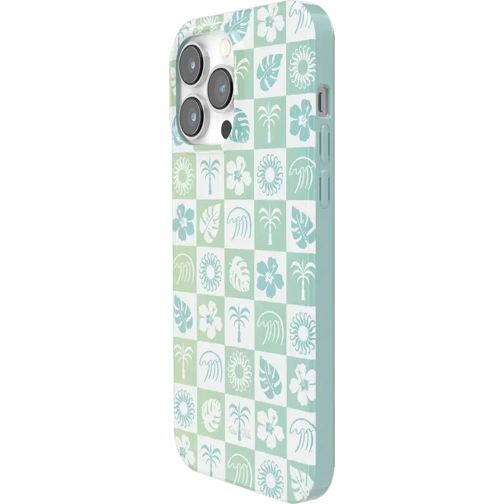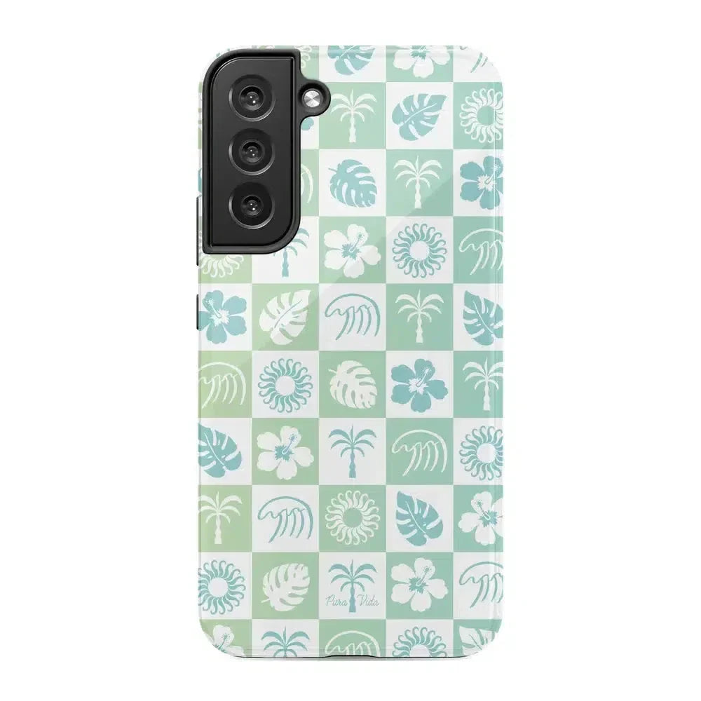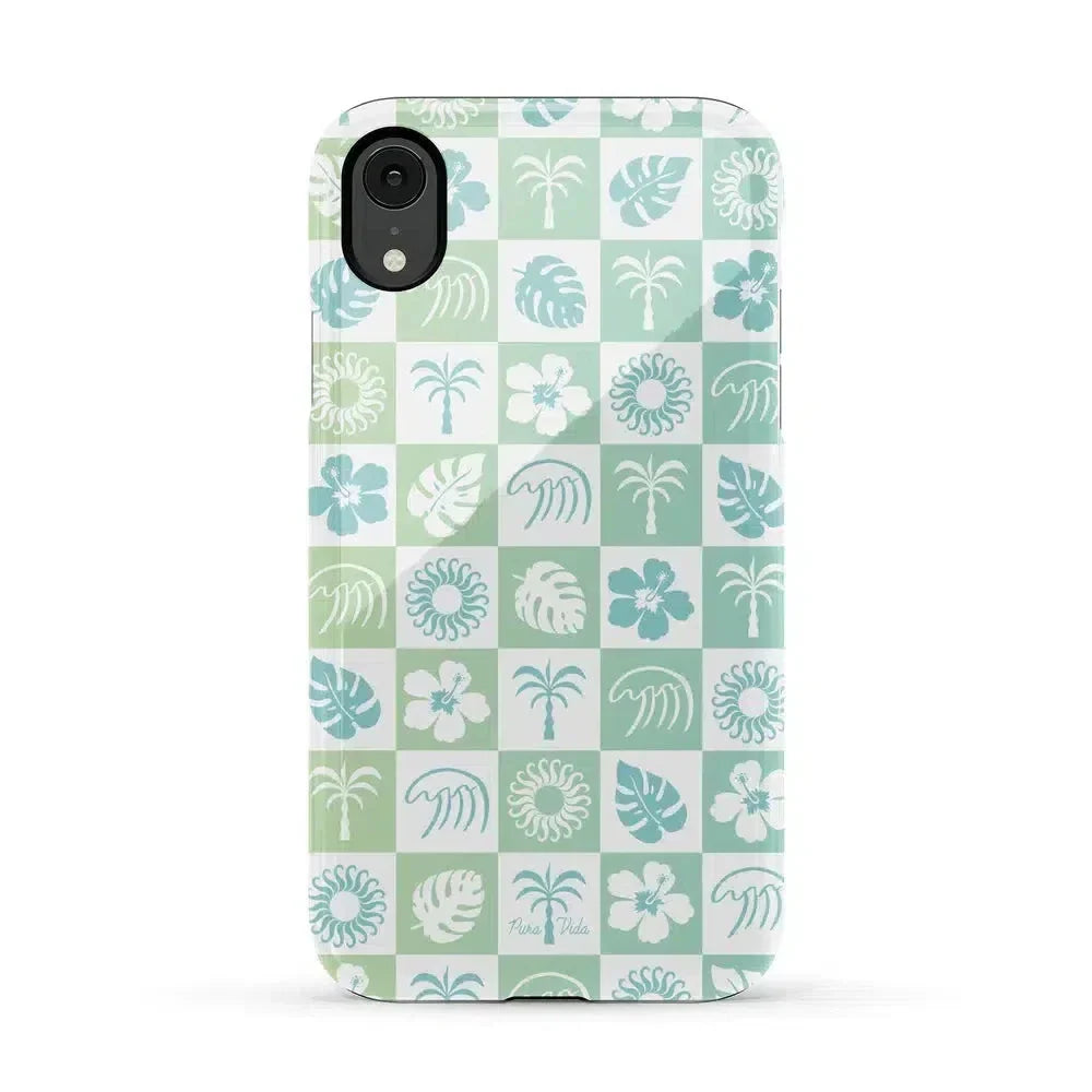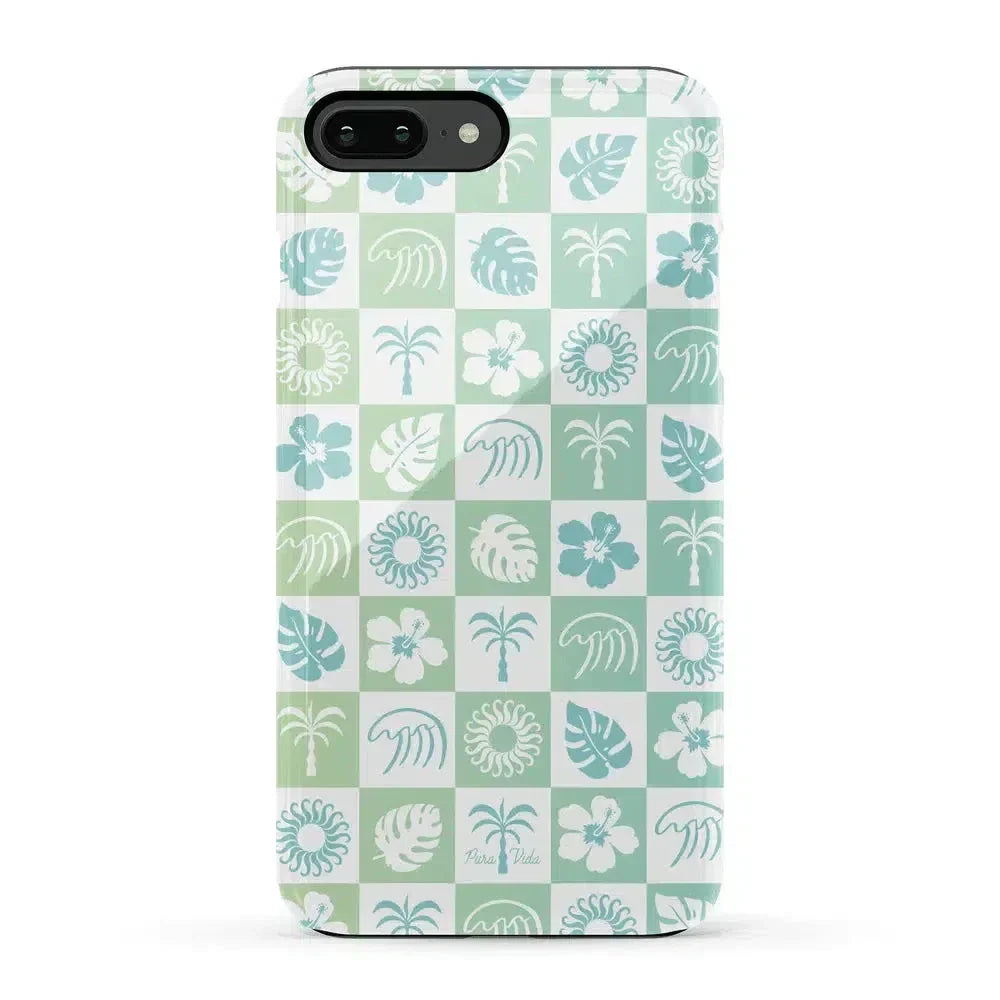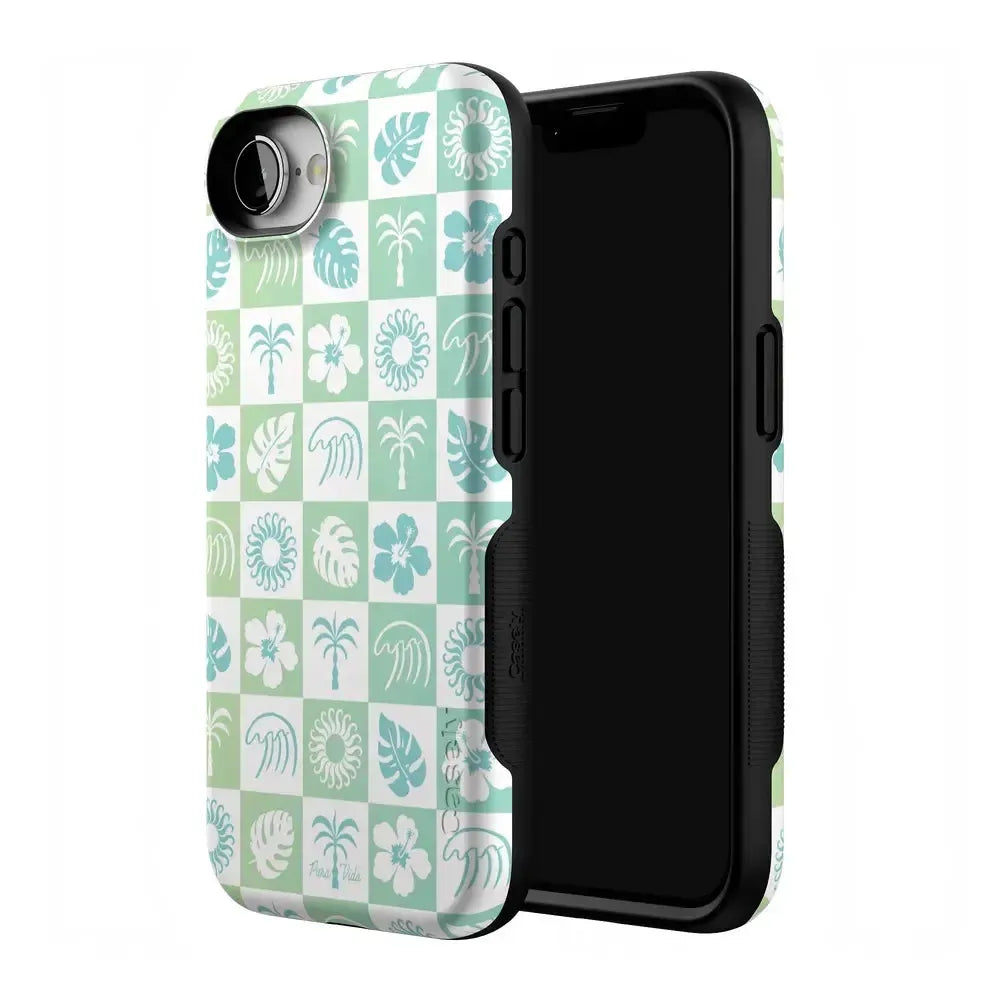 Bring the beach vibes with you wherever you go with the Coastal Checkers phone case. part of our exclusive Pura Vida x Casely collab! Featuring a refreshing mix of seafoam green and ocean blue in a playful checkerboard pattern. this design is a must-have for anyone who loves laid-back. coastal style. Adorned with tropical icons like palm trees. hibiscus flowers. and seashells. this case is the perfect accessory for your next adventure.
