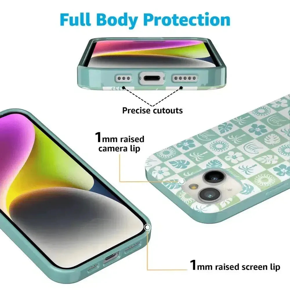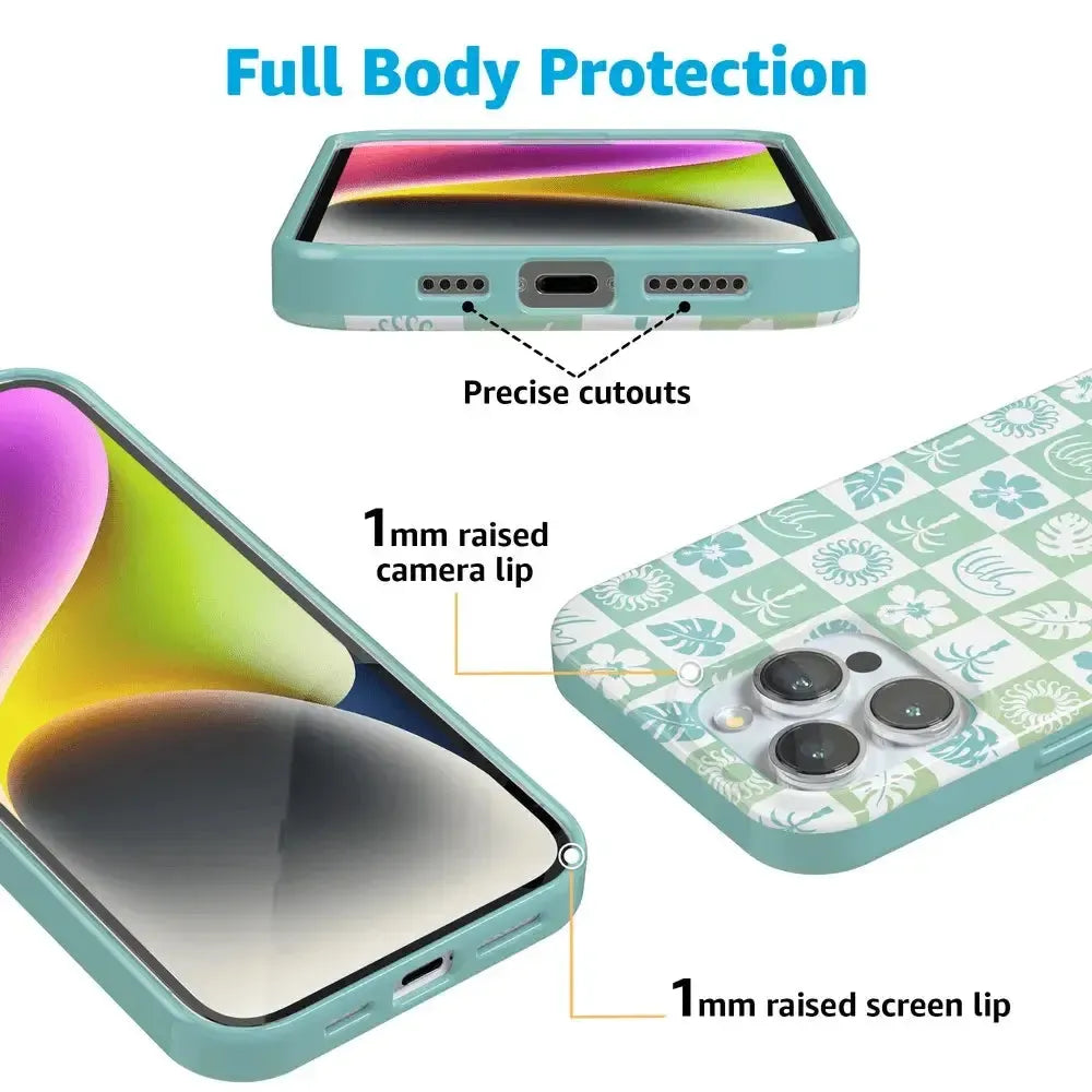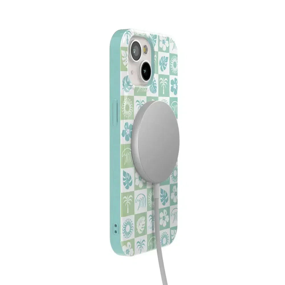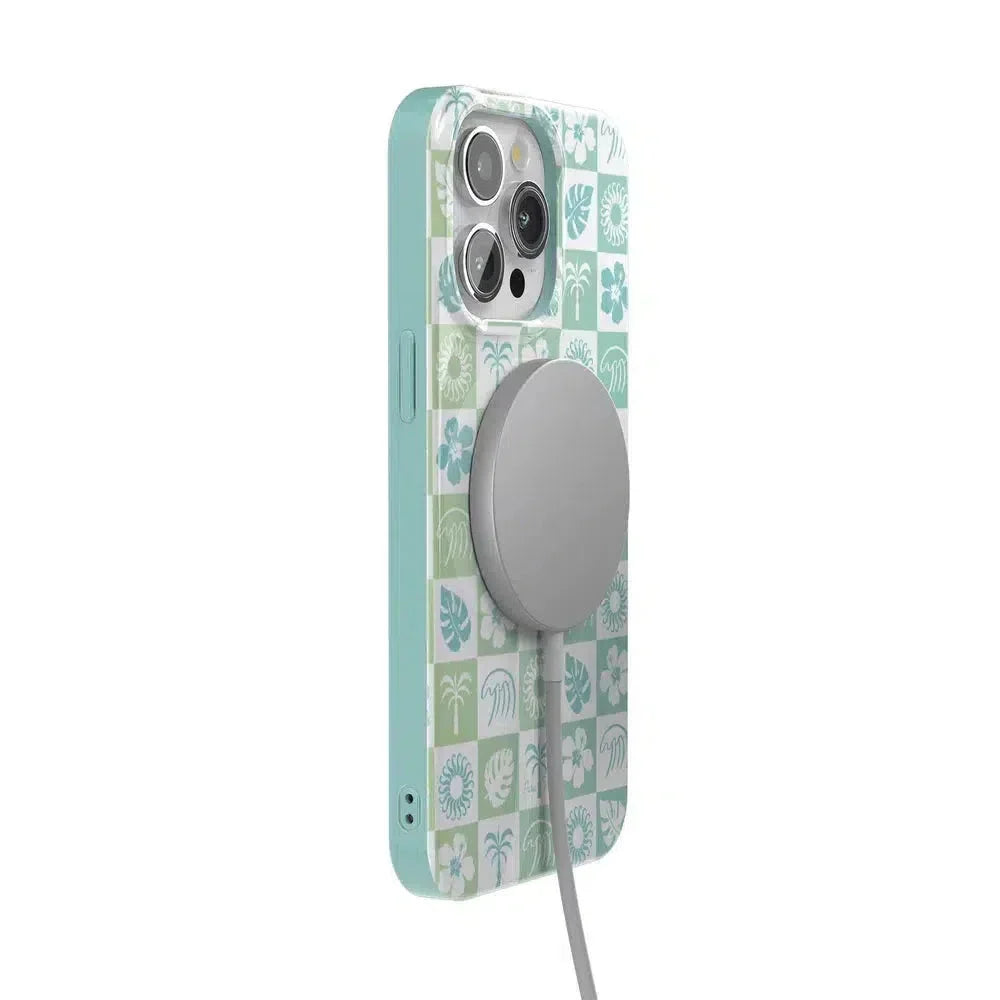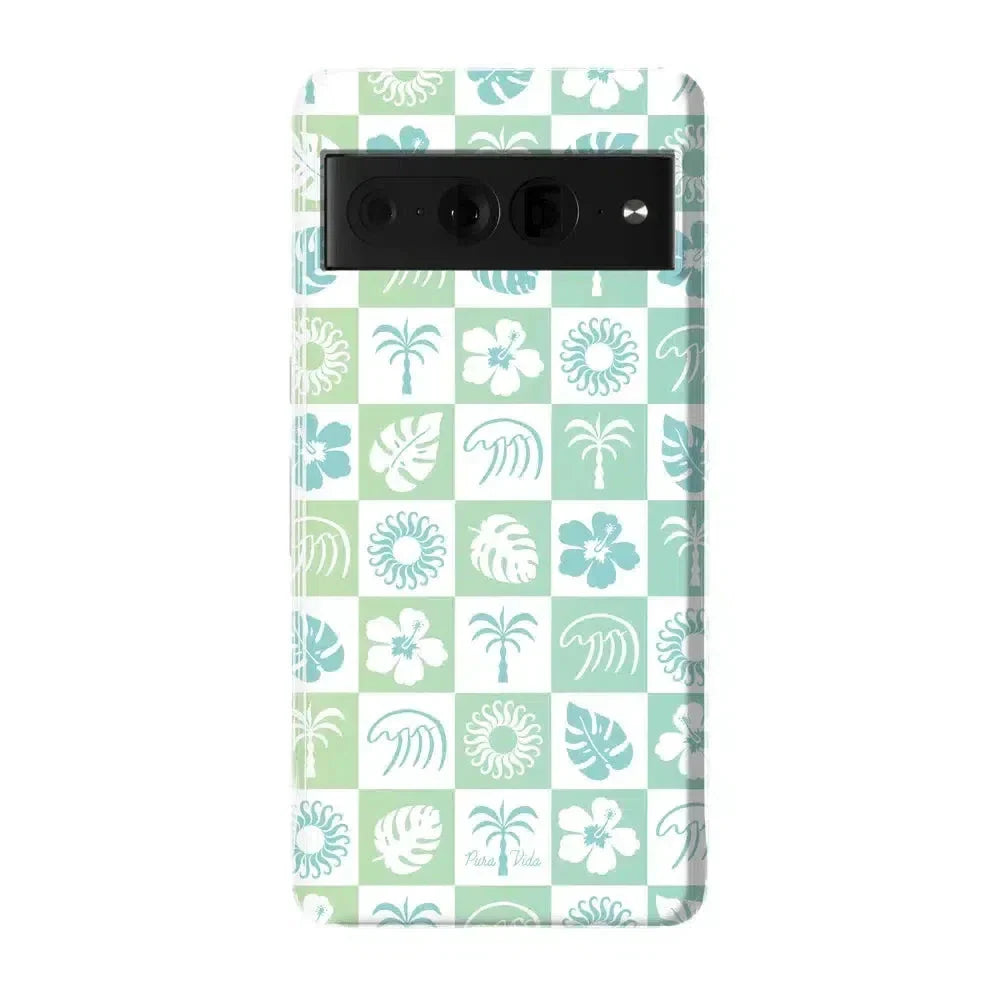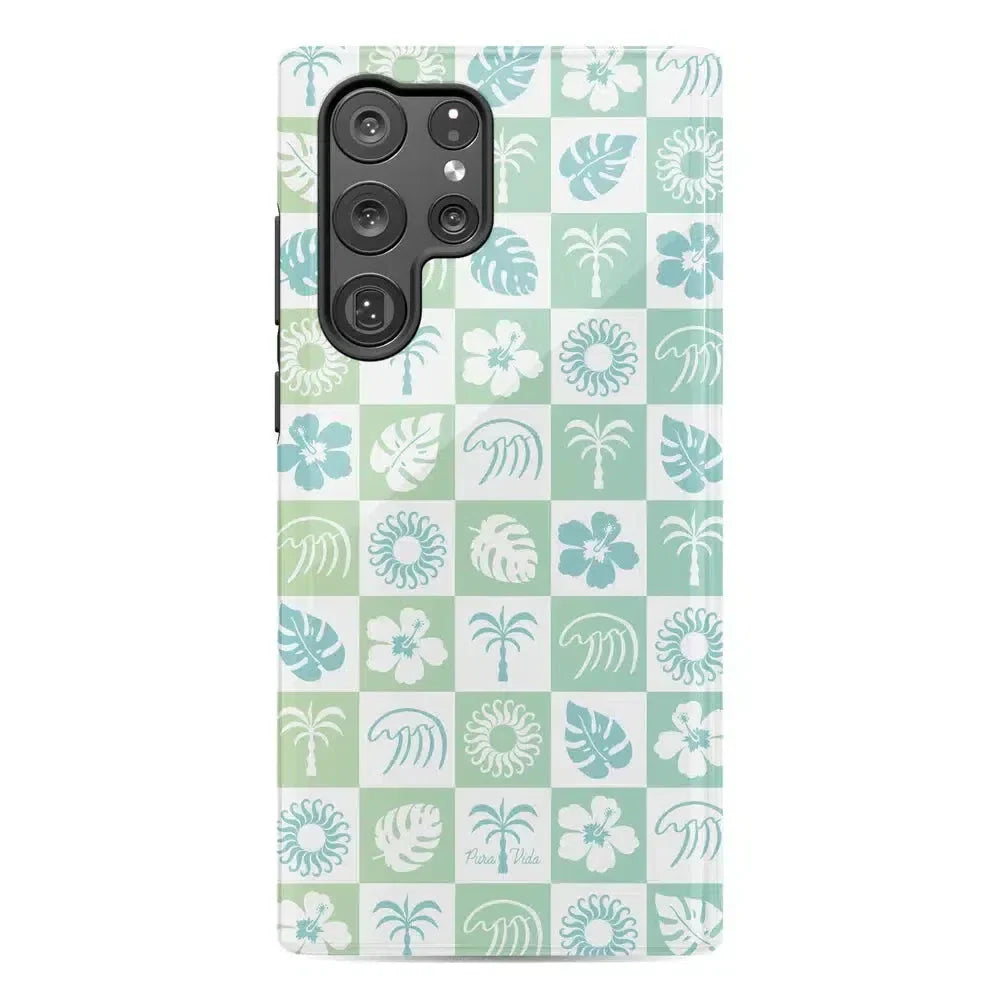 Bring the beach vibes with you wherever you go with the Coastal Checkers phone case. part of our exclusive Pura Vida x Casely collab! Featuring a refreshing mix of seafoam green and ocean blue in a playful checkerboard pattern. this design is a must-have for anyone who loves laid-back. coastal style. Adorned with tropical icons like palm trees. hibiscus flowers. and seashells. this case is the perfect accessory for your next adventure.