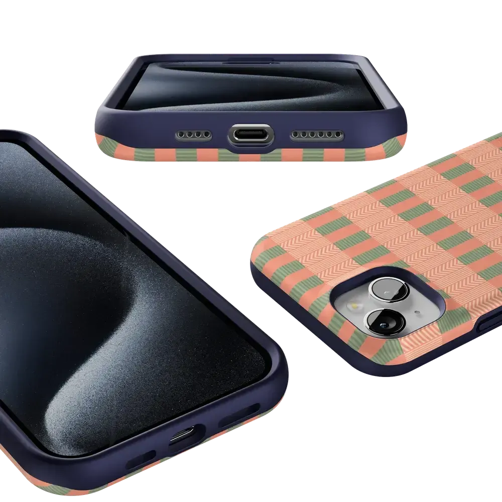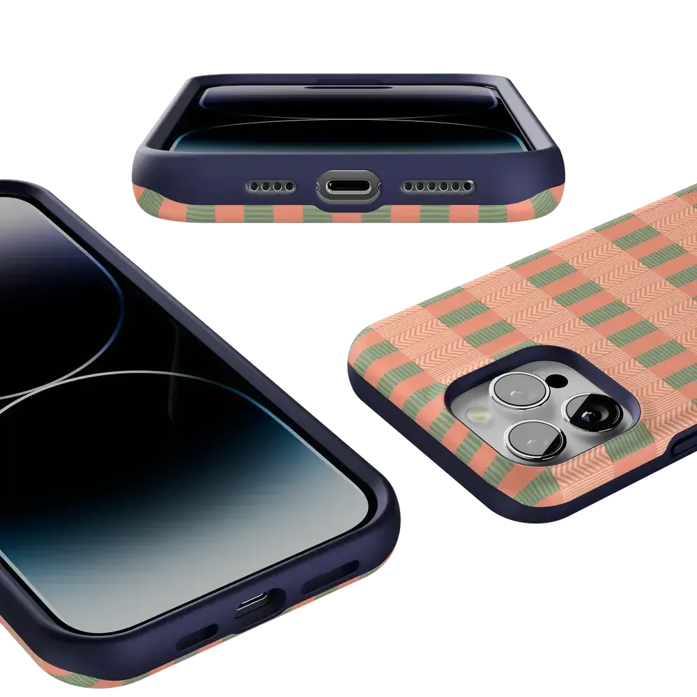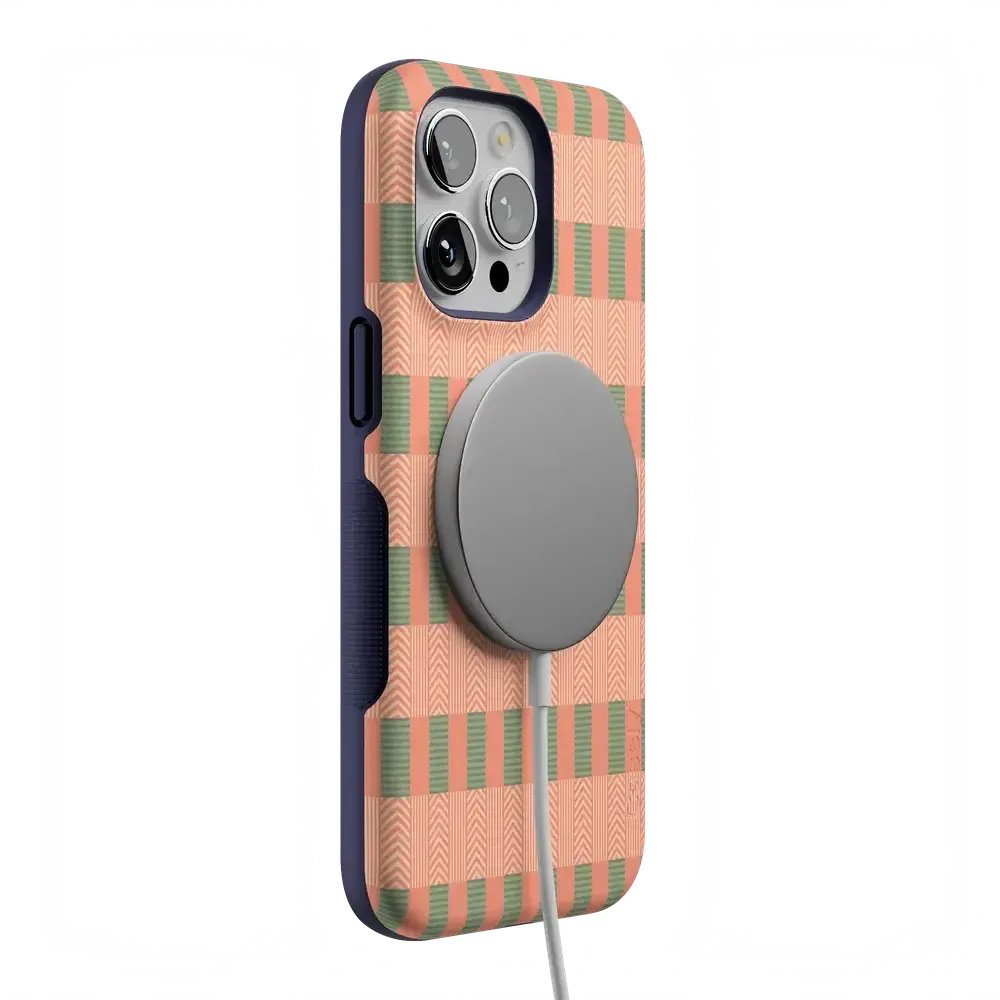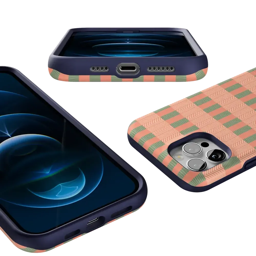 Meet your new poolside essential: the Grand Cabana Case. This bold yet breezy design features alternating peach and olive stripes with subtle chevron detailing that feels right at home at a chic beach club. The color palette is warm. sun-faded. and sophisticated—like a perfectly broken-in cabana towel or your favorite vacation tote.