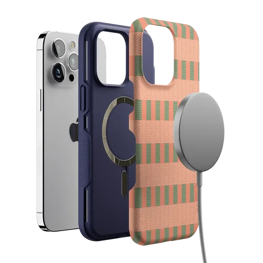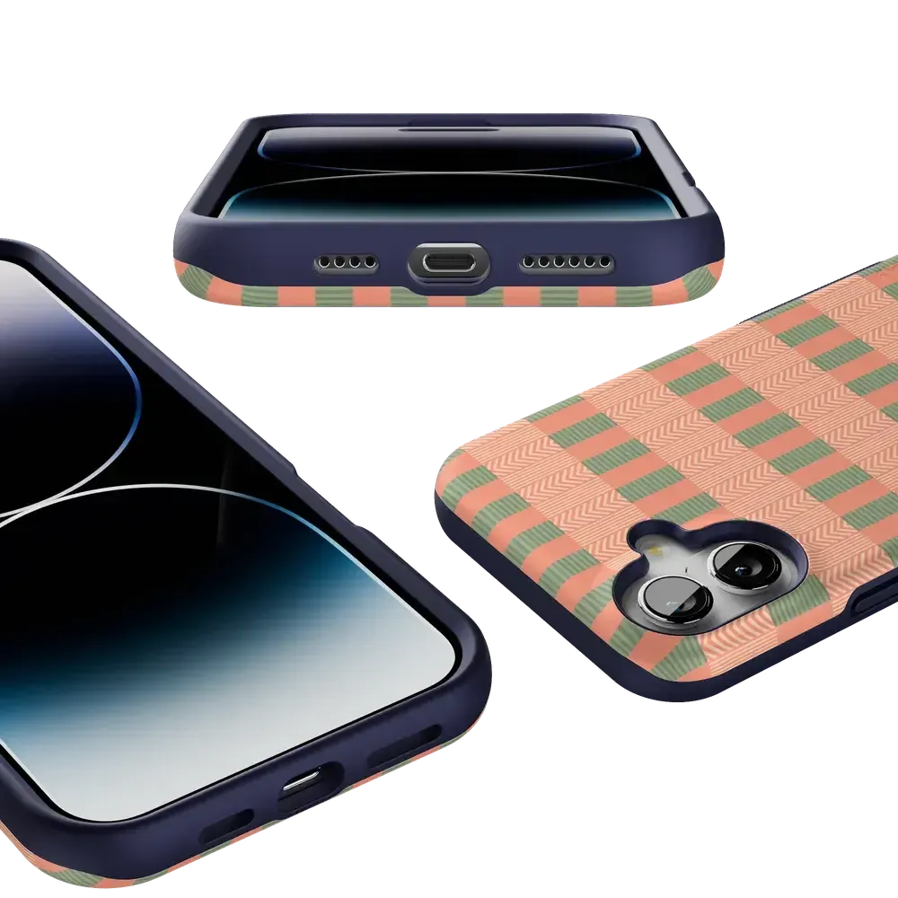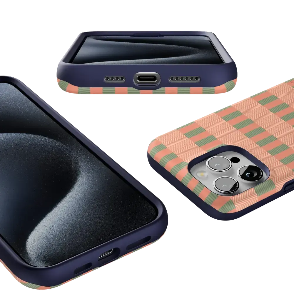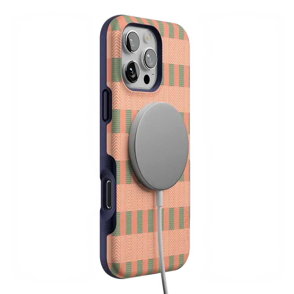 Meet your new poolside essential: the Grand Cabana Case. This bold yet breezy design features alternating peach and olive stripes with subtle chevron detailing that feels right at home at a chic beach club. The color palette is warm. sun-faded. and sophisticated—like a perfectly broken-in cabana towel or your favorite vacation tote.