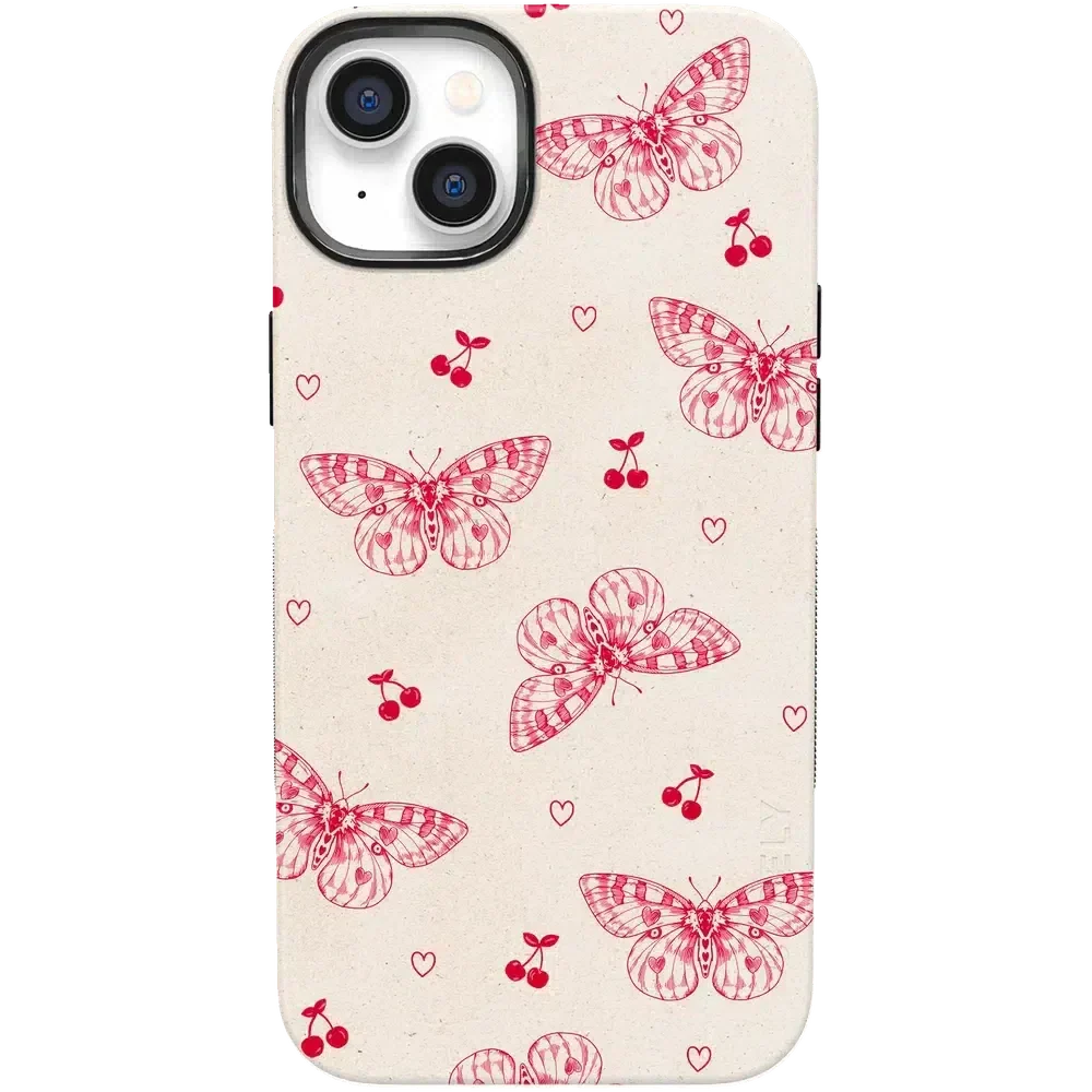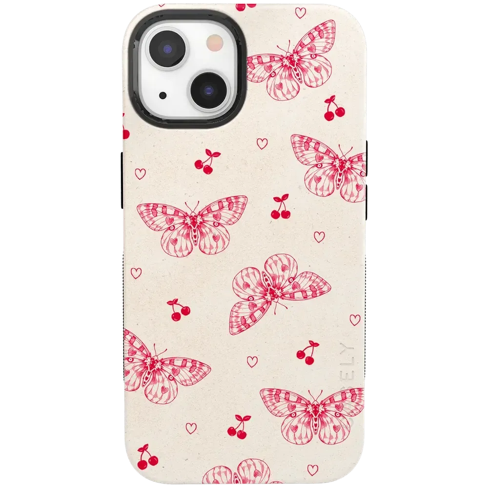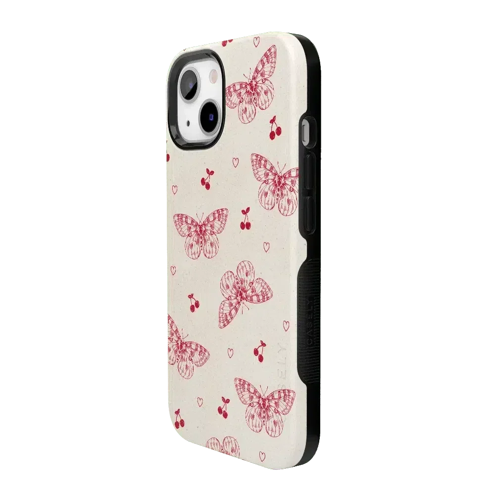Let your phone take flight with the Heart Flutters | Butterfly Case. Featuring intricate red butterflies. charming cherry accents. and sweet little hearts on a soft neutral background. this case is perfect for anyone who loves a romantic and playful vibe.
