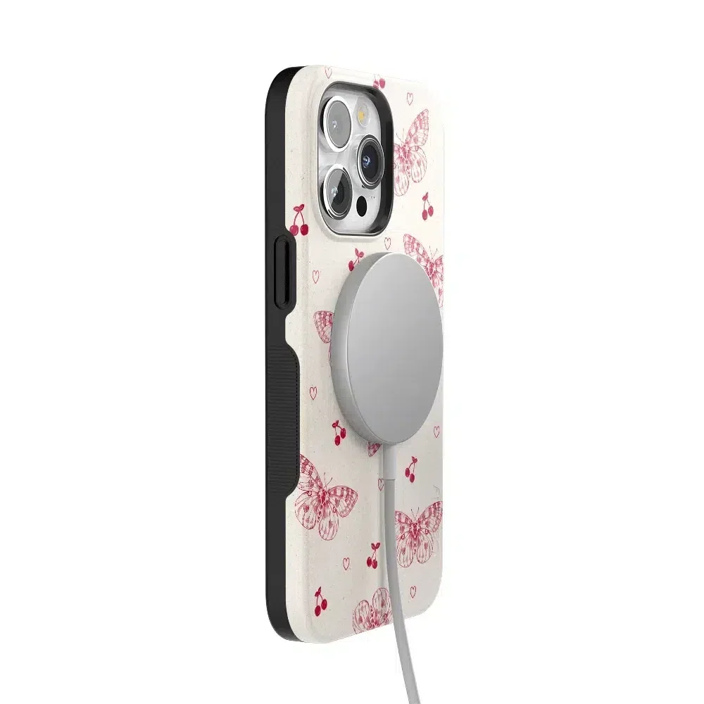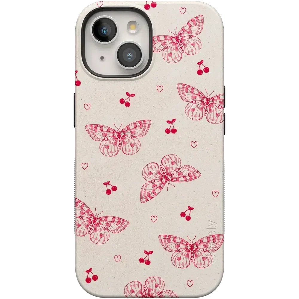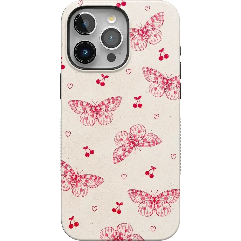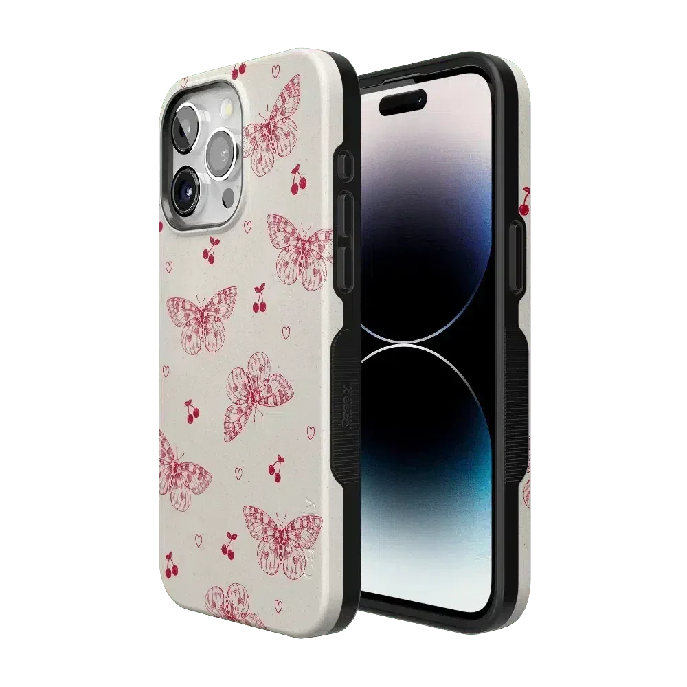 Let your phone take flight with the Heart Flutters | Butterfly Case. Featuring intricate red butterflies. charming cherry accents. and sweet little hearts on a soft neutral background. this case is perfect for anyone who loves a romantic and playful vibe.