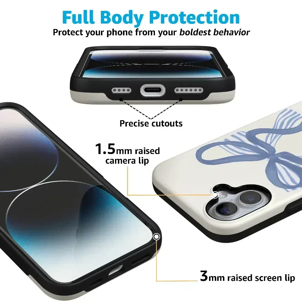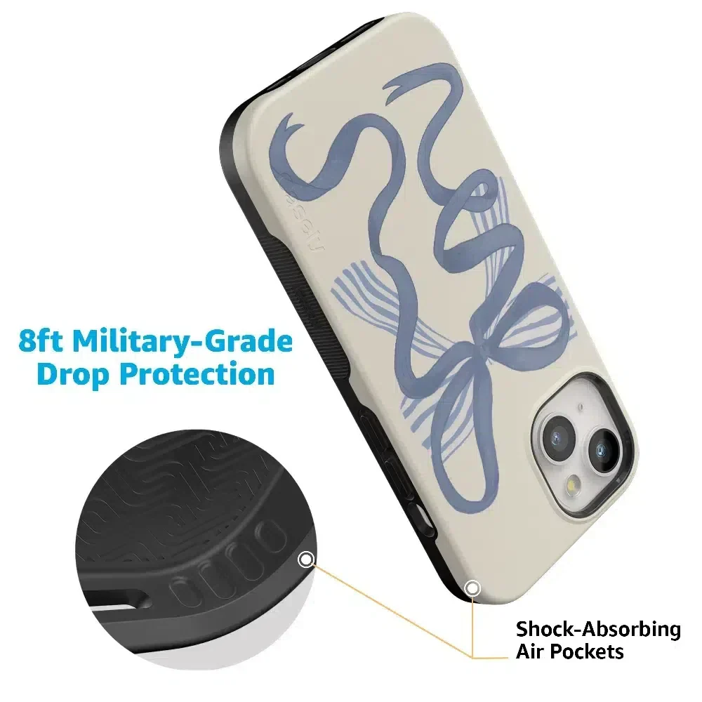 Wrap your phone in elegance with the Heartstrings | Blue Bow Case. the perfect blend of sophistication and charm. Featuring a hand-painted blue bow design on a creamy neutral background. this case adds a touch of refined whimsy to your phone. Inspired by the festive allure of the best-selling. Santa's Favorite. this design transitions effortlessly from holiday cheer to everyday sophistication.