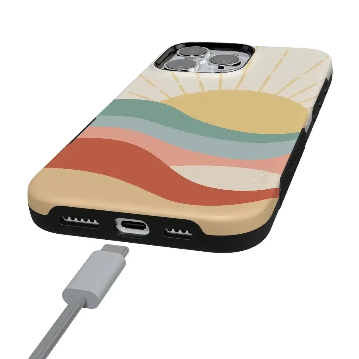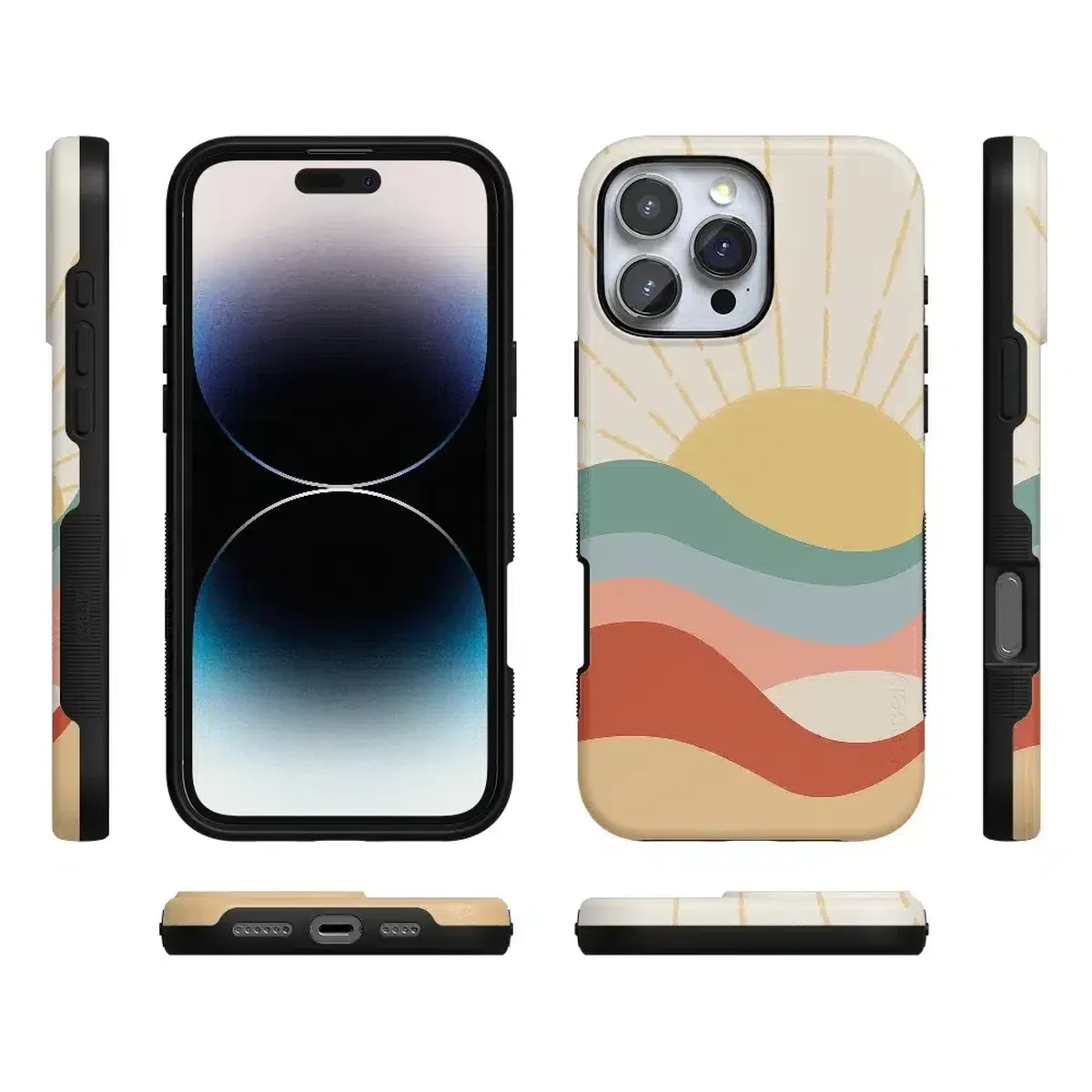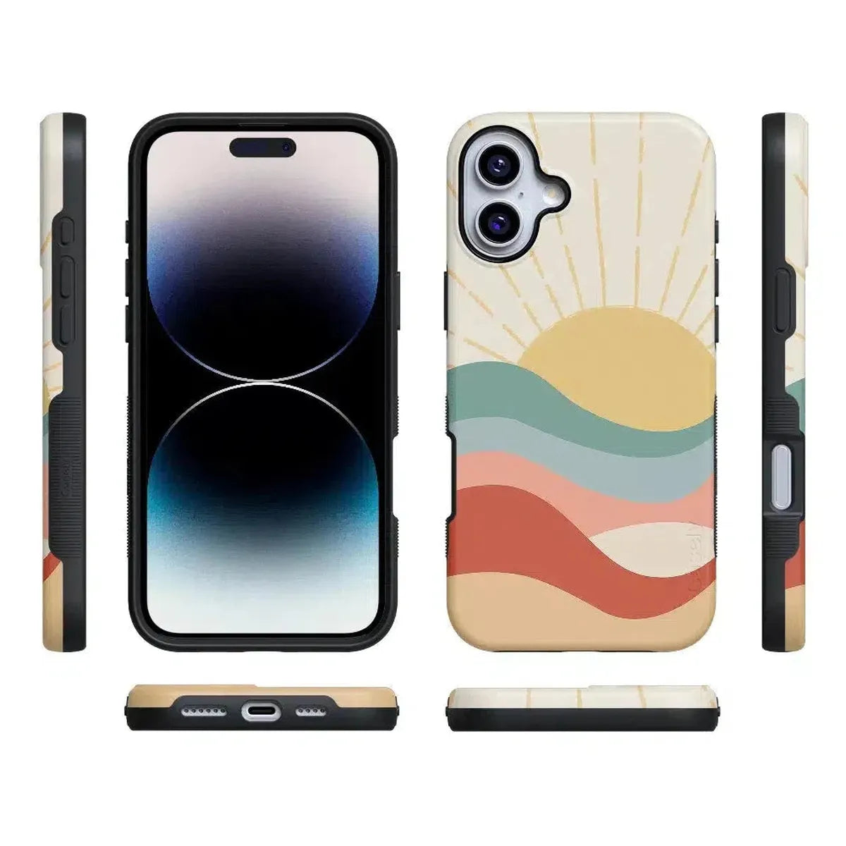 Hey little darling. what better way to wake up every morning than to the sun rising on your very own case? This shining case will add a sparkle of joy to anyone's day. making it the perfect cover to offset the gloomy fall and winter skies. It's impossible not to feel at least 2% happier after looking at the rays of sunshine beaming over rolling colorful hills! With gorgeous sunrise color combinations like yellow. blue. red. and pink. this case is as versatile as it is eye-catching. This cover is a conversation starter to return smiles to your face and your friends! This cheery cover is also perfectly able to withstand hard falls. With specifically rounded edges to protect your phone screen and volume buttons. you'll never have to worry if you're sacrificing protection for looks. This phone case can be purchased for all iPhones 6 and up. the latest Samsung models. and the latest Note models.