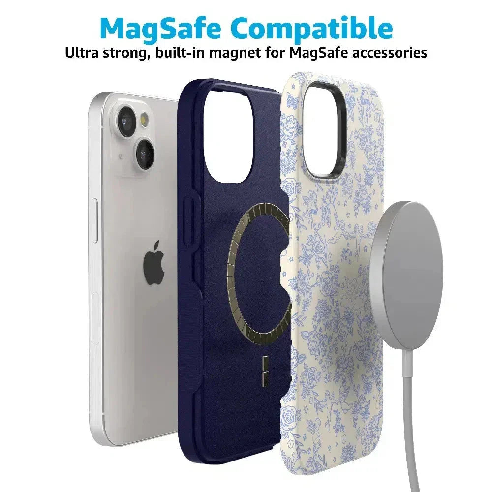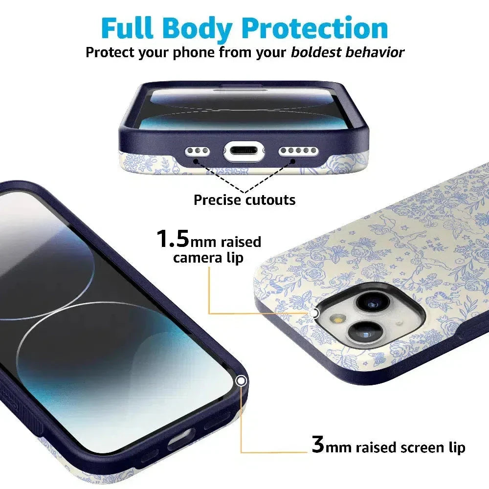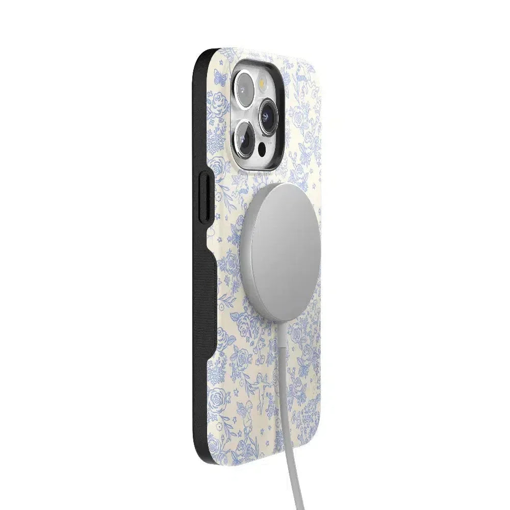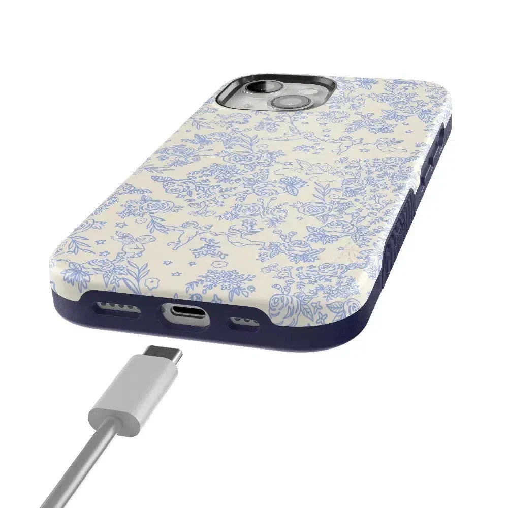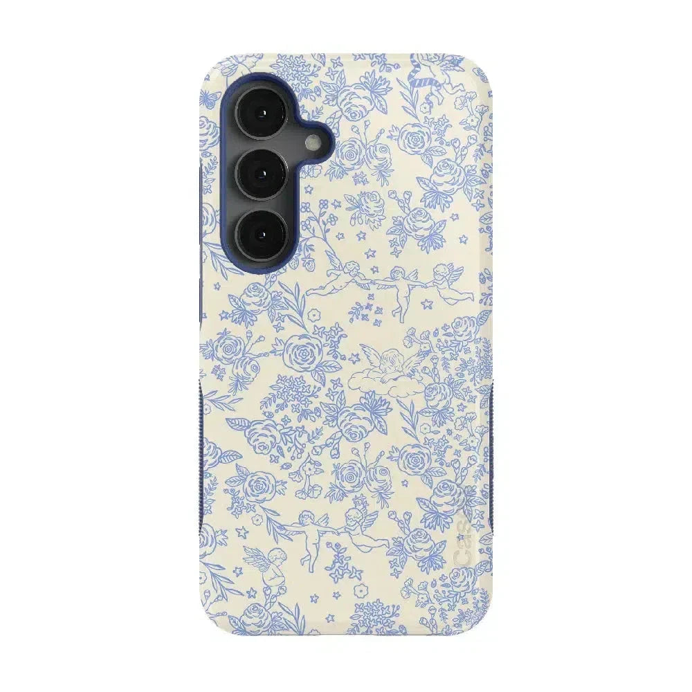 Embrace elegance and whimsy with the Cupid's Canvas | Periwinkle Floral Case. This delicate design features charming cherubs and intricate floral patterns in soft periwinkle hues. bringing a touch of romance and artistry to your everyday life. Whether you're a fan of classic beauty or looking for something unique to protect your phone. this case offers both stunning visuals and solid protection.